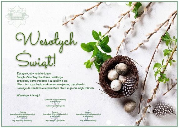 Komendant Wojewódzki Policji w Białymstoku nadinspektor Kamil Borkowski w imieniu własnym oraz kierownictwa podlaskiego garnizonu zwraca się do policjantów, policjantek, pracowników Policji, emerytów i rencistów policyjnych oraz przedstawicieli związków zawodowych, przekazując życzenia z okazji Świąt Wielkanocnych.