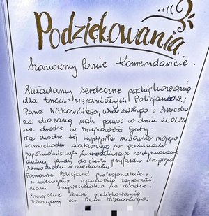 Podziękowania od osób, którym się pomogło, są dla policjantów najwyższym wyrazem uznania. To właśnie do Komendy Powiatowej Policji w Grajewie wpłynęły następujące słowa: „Składamy serdeczne podziękowania dla trzech wspaniałych Policjantów (…)".